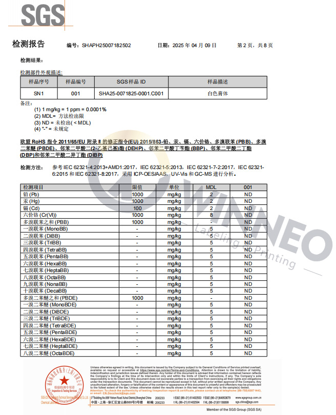 Questo è il rapporto originale dei test di composizione per le materie prime utilizzate nel tampone per stampa tampografica WINNEO. Questo rapporto dimostra che le materie prime utilizzate nel nostro tampone per stampa tampografica soddisfano gli standard qualitativi. Materie prime qualificate garantiscono che la successiva produzione del tampone sia conforme agli standard pertinenti.